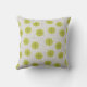 This throw pillow has a mid-century modern design of tan arches repeating on white as a background with repeating green-gold circles with darker green-gold starbursts inside them.