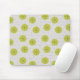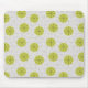 This mouse pad has a mid-century modern design of tan arches repeating on white as a background with repeating green-gold circles with darker green-gold starbursts inside them.