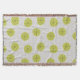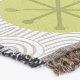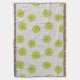 This throw blanket has a mid-century modern design of tan arches repeating on white as a background with repeating green-gold circles with darker green-gold starbursts inside them.