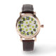 This women's watch has a mid-century modern design of tan arches repeating on white as a background with repeating green-gold circles with darker green-gold starbursts inside them.
