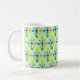 This mug is covered with a mid-century modern design of atomic starbursts on a green background.