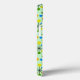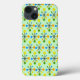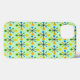 This phone case is covered with a mid-century modern design of atomic starbursts on a green background.