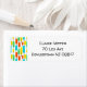 These return address labels have a mid-century modern design of long ovals in yellow, orange, green, and turquoise with black lines with circles on the ends.