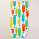 This towel set has an orange washcloth, a green hand towel, and a bath towel with a mid-century modern design of long ovals in yellow, orange, green, and turquoise with black lines with circles on the ends.