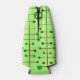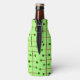 This bottle cooler has a mid-century modern design of black vertical lines with brown vertical lines and green circles.
