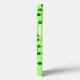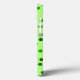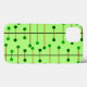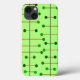 This phone case has a mid-century modern design of black vertical lines with brown vertical lines and green circles.