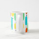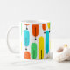 This mug has a mid-century modern design of long ovals in yellow, orange, green, and turquoise with black lines with circles on the ends.