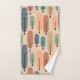 This towel set has a mid-century modern design of long ovals in peach, green, blue, teal, and light brown with black lines with circles on the ends.