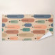 This towel set has a peach washcloth, a teal hand towel, and a bath towel with a mid-century modern design of long ovals in peach, green, blue, teal, and light brown with black lines with circles on the ends.