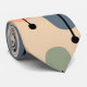 This necktie has a mid-century modern design of long ovals in peach, green, blue, teal, and light brown with black lines with circles on the ends.