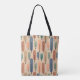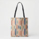 This tote bag has a mid-century modern design of long ovals in peach, green, blue, teal, and light brown with black lines with circles on the ends.