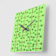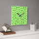 This wall clock has a mid-century modern design of black vertical lines with brown vertical lines and green circles.