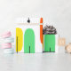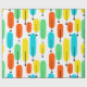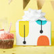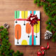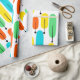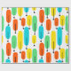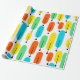 This rapping paper has a mid-century modern design of long ovals in yellow, orange, green, and turquoise with black lines with circles on the ends.