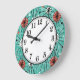 10.75” round acrylic wall clock with a 50s-style image of white and red orbs with black star jacks on turquoise, and a clock face with large, readable numbers in a white circle with a black border. See the entire Nifty 50s Clock collection in the DECOR | Clocks section.