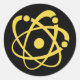 Asymmetrical atom symbol, black or yellow graphic, t-shirts, hoodies, buttons, stickers, cards, gifts.
