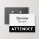 Easily personalise our rectangle pin back button badge with recipient name, job title, or other custom text. It attaches with a safety pin back. Sold in black and other colours (all colours are customisable). Our rectangle buttons are 3.5 inch x 2.5 inch. Made in USA. No minimum order quantity and no setup fee.