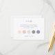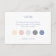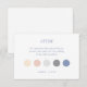 This stylish attire card features 5 colour dots which include a chic dusty blue, a blush pink rose, a pastel creamy peach and 2 shades of grey. The background, both front and back is a crsip white.
