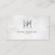 This elegant professional attorney business card features an elegant marble texture background. Your monogram letter appears in as a bold fancy script letter in a subtle dark grey hue within a silver textured square. Your name and title appear in the lower middle section, below the silver monogram square. Perfect for professional, administration, management, professional, sophisticated, contemporary, minimalist themes.