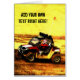 A daring motor sports driver rips across the dirt in his side by side SXS offroad utility atv or utv. Red and white coloured paint with matching racegear and helmet, on a yellow and brown background. Gouache cartoon style painted effect derived from an original sports action photograph.
