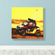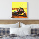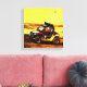 A gouache painted style image with cartoon like details showing a daring motorsports driver ripping across a dirt racetrack in a side by side style all terrain vehicle. It's powerful engine and meaty treaded tires really pull the flashy four wheel drive across the track. Warm shades of yellow and brown for the background, and a red and white coloured machine and riding gear make this masterpiece the perfect choice for any extreme outdoor sports enthusiast's bedroom or mancave.