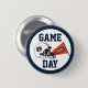 This spirited button design proudly showcases support for Auburn University on game day! It features a classic football helmet at its centre, adorned with the iconic blue "AU" logo and a blue stripe. Above and below the helmet, the words "GAME" and "DAY" are boldly presented in blue, arched lettering, perfectly capturing the excitement of game day. Two pennants extend from behind the helmet, one bearing an orange "AU" on a blue background and the other "Tigers" on an orange background, adding to the energetic display. The design is set against a crisp white background with a thin orange and bold blue border, making it an ideal way to show your allegiance to Auburn University's cherished traditions.