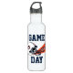 This spirited water bottle proudly showcases support for Auburn University on game day! It features a classic football helmet with the iconic blue "AU" logo, centred between the words "GAME" and "DAY" in bold blue lettering. A vibrant orange pennant extends from behind the helmet, proudly displaying a stylised tiger mascot face and the word "TIGERS." The design is set against a clean white background, making it an ideal way to stay hydrated while representing allegiance to the Auburn Tigers, whether at the game or on the go.