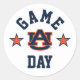 This spirited round sticker proudly showcases support for Auburn University on game day! It features the iconic Auburn "AU" logo prominently displayed at its centre, vibrant in its traditional orange and blue. Above and below the logo, the words "GAME" and "DAY" are boldly presented in blue, arched lettering, perfectly capturing the excitement of game day. Two vibrant orange stars with blue outlines flank the 'AU' logo, adding to the energetic display. This impactful and recognisable design is an ideal way to display allegiance to the Auburn Tigers on any surface.