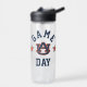 This spirited water bottle proudly showcases support for Auburn University on game day! It features the iconic Auburn "AU" logo prominently displayed at its centre, vibrant in its traditional orange and blue. Above and below the logo, the words "GAME" and "DAY" are boldly presented in blue, arched lettering, perfectly capturing the excitement of game day. Two vibrant orange stars with blue outlines flank the 'AU' logo, adding to the energetic display. This impactful and recognisable design is ideal for staying hydrated while representing allegiance to the Auburn Tigers, whether at the game or on the go.