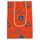 This design pattern features Auburn University's emblematic "AU" logo in bold navy blue with an orange outline. The word "Auburn" appears in stylised, uppercase navy blue letters with orange accents, providing a prominent contrast against the white background. An additional graphic of a tiger's eyes, enclosed in an oval shape with an orange border, reinforces Auburn’s iconic mascot. Scattered across the design are minimalist starburst shapes and small dots in navy blue, adding a festive and dynamic touch that complements the university's spirit and colours.