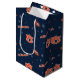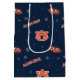 This design pattern features Auburn University's emblematic "AU" logo in bold navy blue with an orange outline. The word "Auburn" appears in stylised, uppercase navy blue letters with orange accents, providing a prominent contrast against the white background. An additional graphic of a tiger's eyes, enclosed in an oval shape with an orange border, reinforces Auburn’s iconic mascot. Scattered across the design are minimalist starburst shapes and small dots in navy blue, adding a festive and dynamic touch that complements the university's spirit and colours.