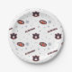 This design pattern features Auburn University's emblematic "AU" logo in bold navy blue with an orange outline. The word "Auburn" appears in stylised, uppercase navy blue letters with orange accents, providing a prominent contrast against the white background. An additional graphic of a tiger's eyes, enclosed in an oval shape with an orange border, reinforces Auburn’s iconic mascot. Scattered across the design are minimalist starburst shapes and small dots in navy blue, adding a festive and dynamic touch that complements the university's spirit and colours.