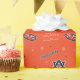 This design pattern features Auburn University's emblematic "AU" logo in bold navy blue with an orange outline. The word "Auburn" appears in stylised, uppercase navy blue letters with orange accents, providing a prominent contrast against the white background. An additional graphic of a tiger's eyes, enclosed in an oval shape with an orange border, reinforces Auburn’s iconic mascot. Scattered across the design are minimalist starburst shapes and small dots in navy blue, adding a festive and dynamic touch that complements the university's spirit and colours.