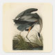 John James Audubon was one of the America's great naturalists, documenting hundreds of birds species with great precision as he made his way across America and drew in detail the wild birds of America. Audubon then published lithographs of his scientific drawings of the American birds, and this Great Blue Heron is among the best Audubon lithographs made by Audubon. The Great Blue Heron is actually a slate grey heron with blue tints and with striking markings- a black shoulder, white face, and a white crown with black stripes. It's a large heron - the largest in theU.S. The Great Blue Heron has a bill that is strong, long and yellow. The colours of the heron's thighs are a chestnut brown. The Audubon great blue heron is standing in the marsh, with marsh grass around it, and it is obviously looking for fresh fish, as its great yellow beak is turned down towards the water. This Audubon bird print of the Great Blue Heron is a beautiful bird print, and a classic image from the early 1800s.