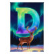 Add a sense of wonder and northern magic to your space with this Aurora Letter D poster. A radiant letter D rises above a snowy forest, illuminated by flowing ribbons of Northern Lights in glowing shades of turquoise, emerald, and violet. The aurora dances across the night sky, casting a soft shimmer over the snow and gently illuminating a quiet reindeer standing at the base of the monogram.