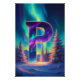 Bring peaceful winter beauty into your space with this Aurora Letter P wall art. A glowing letter P stands tall in a snow-covered forest, illuminated by flowing ribbons of Northern Lights in rich shades of emerald, turquoise, and soft violet. Snow-dusted pine trees rise gently in the background, their frosted branches catching subtle aurora reflections and creating a calm, atmospheric arctic scene.