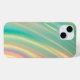 This phone case features a dreamy design woven from colour and light. It's chraacterised by a delicate gradient of turquoise green, pale pink, and gold that changes smoothly, much like the aurora borealis or the inside of a mother-of-pearl shell. The flowing curves and sparkling streaks of light give it the impression of a dynamic piece of art.
