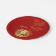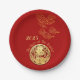 Golden paper-cut of a Rabbit into a circle + golden Chinese Auspicious clouds (line graphic). Design on paper plate with red background and texts: 2023, The Year of The Rabbit. Matching greeting card, holiday postcard, invitation, craft supplies, party supplies and more... Perfect for Chinese New Year of the Rabbit 2023 or birthday (people born in Rabbit Year).