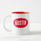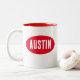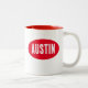 A red Austin design on a white mug. Austin the capital city of Texas is vibrant and most preferred city of the United States to live in.