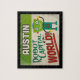 A charming Austin Texas vintage travel jigsaw puzzle featuring a funny and friendly robot, along with fun retro style text that says, "See you in Austin"