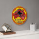 The Australia travel design on this round wall clock is made to resemble a vintage travel sticker, with the edges slightly distressed. It shows a black silhouette of a kangaroo over a red outline of the Australian map picture. The words say, "Australia / The Land Down Under." The design also includes a small heart. If you love the country of Australia and the retro vacation-sticker look, this pretty clock is perfect for you.
