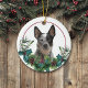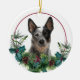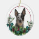 On the front of this Holiday ornament is a beautiful portrait of a blue merle Australian Cattle Dog peeking out of a holly and evergreen bough. Red berries and pine cones decorate the holly and pine sprigs. The image is placed on a white circle within a thin red line circle. The back of the ornament has the same evergreen bough wreath and circle with your custom text in red.