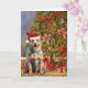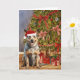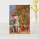 This Christmas card features a watercolor portrait of an Australian Cattle Dog wearing a Santa hat sitting under a Christmas tree.