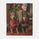 An enchanting scene captures the essence of cosiness and holiday spirit as furry companions adorned in Santa Claus hats gather around a crackling fireplace. The warmth emanating from the hearth creates a snug atmosphere for these adorable canines, while festive stockings hang in the background, enhancing the merry ambiance. The charming illustration portrays a timeless image of companionship and festive joy, perfect for celebrating the holiday season with a touch of canine charm.