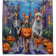 Adorable Australian Kelpies dressed in playful Halloween costumes carry pumpkin buckets while trick-or-treating under the moonlit sky. This festive design highlights the breed’s sleek build, alert eyes, and hardworking spirit, perfectly capturing the spooky yet fun atmosphere of Halloween night. A lively celebration for dog lovers and Halloween fans alike.