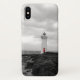 A black and white photo showing a lighthouse at the beach, on the Australian coast, with selective red coloring to add detail.