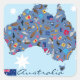 Blue sticker with all the famous items of Australia in the shape of the country. Do you know what Australia is famous for? Can you discover all the famous stereotypes from the land downunder?