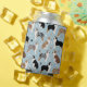 Cute Australian Shepherds / Aussie dogs in black, brown and merle coats sit and stand scattered dog bones and paw prints on a light blue background.