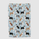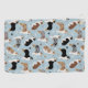 Cute Australian Shepherds / Aussie dogs in black, brown and merle coats sit and stand scattered dog bones and paw prints on a light blue background.