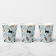 Cute Australian Shepherds / Aussie dogs in black, brown and merle coats sit and stand scattered dog bones and paw prints on a light blue background.
