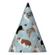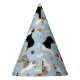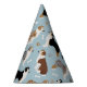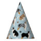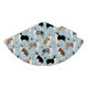 Cute Australian Shepherds / Aussie dogs in black, brown and merle coats sit and stand scattered dog bones and paw prints on a light blue background.